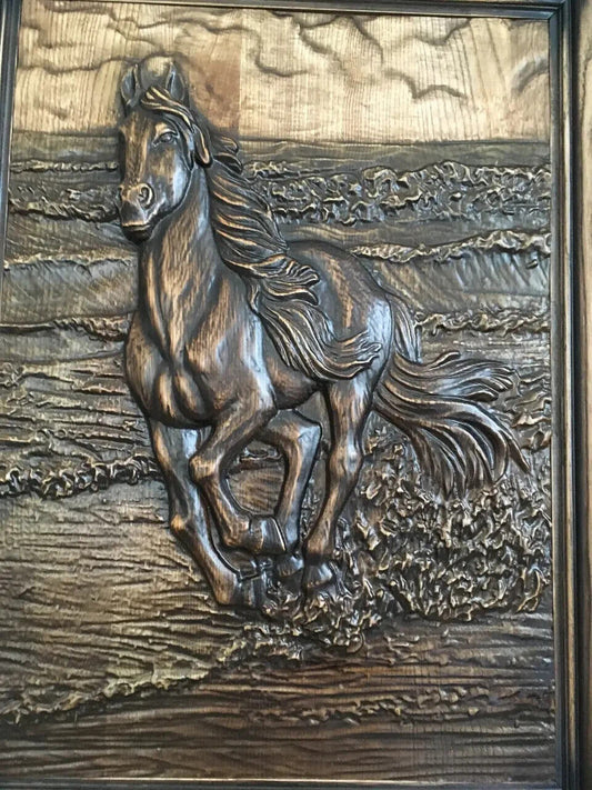 26" Horse Large Wood Carving Picture 3D Art Work Handmad Gift Panno Wall Decor