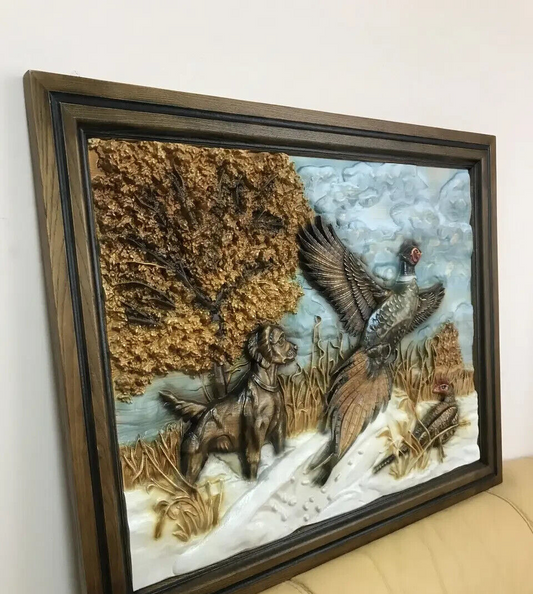 Pheasant Hunting Large Wood Carving Picture 3D Handmade Gift Panno Wall Decor