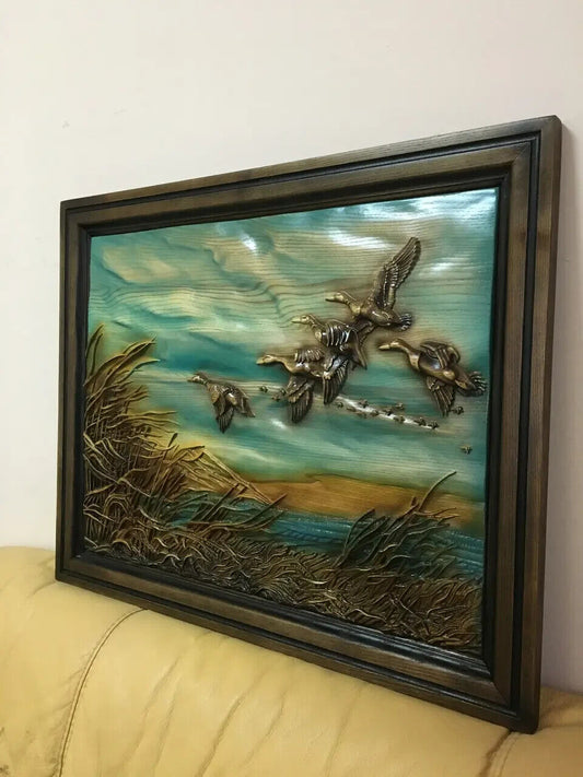 28" Ducks Hunting Large Wood Carving Picture 3D Handmade Gift Panno Wall Decor