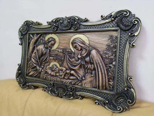 32" Holy Family Large Wood Carving Picture 3D Art Work Gift Panno Wall Decor