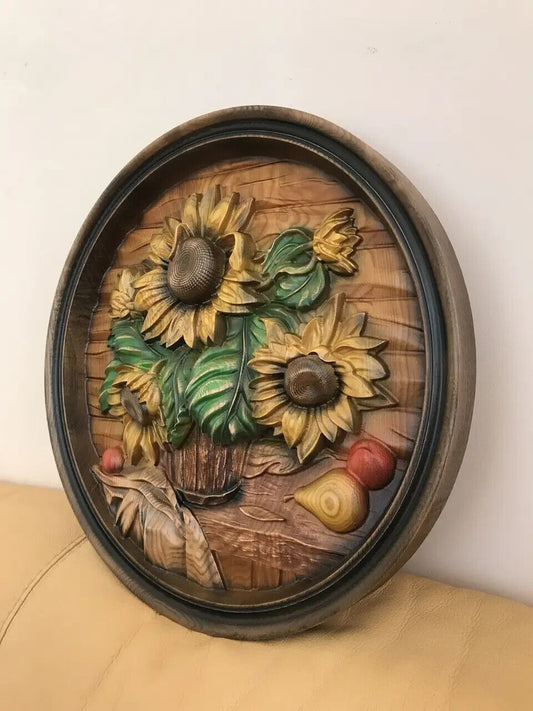 16" Sunflower Large Wood Carving Picture 3D Handmade Gift Panno Wall Decor