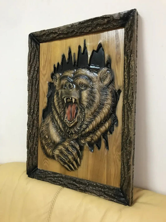 30" Bear Hunting Large Wood Carving Picture Gun 3D ArtWork Gift Panno Wall Decor