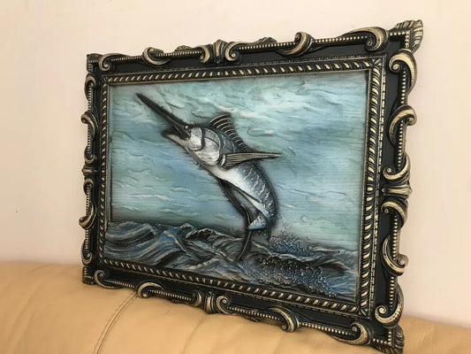 Fishing Fish Marlin Large Wood Carving Picture 3D Handmade Gift Panno Wall Decor