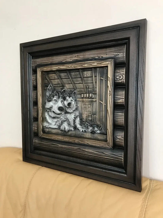 25" Husky Dog Large Wood Carving Picture 3D Handmade Gift Panno Wall Decor