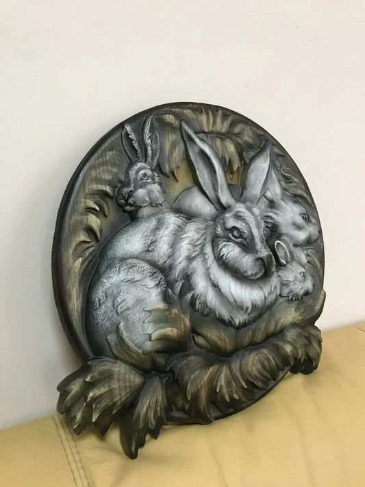 Hare Hunting Rabbit Wood Carving Picture Gun 3D Art Work Gift Panno Wall Decor