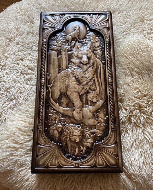 Artwork Backgammon "Wolf" – "Animal" Handcrafted Wooden Backgammon Set (58x28cm / 22.8x11 inches)