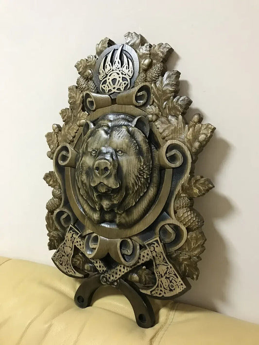 Bear Hunting Large Wood Carving Picture Gun 3D Art Work Gift Panno Wall Decor