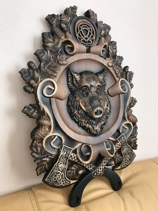 Wild Boar Hunting Wood Carving Picture Gun 3D Art Work Gift Panno Wall Decor