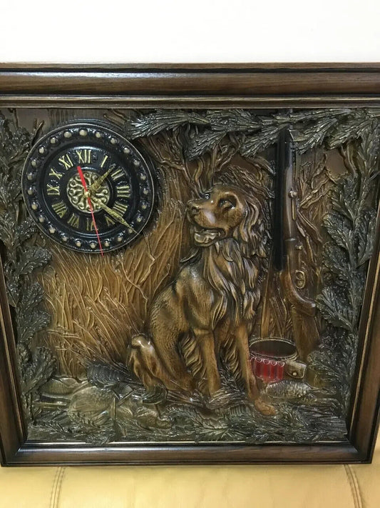 Dog Hunting Clock Wood Carving Picture Gun 3D Handmade Gift Panno Wall Decor